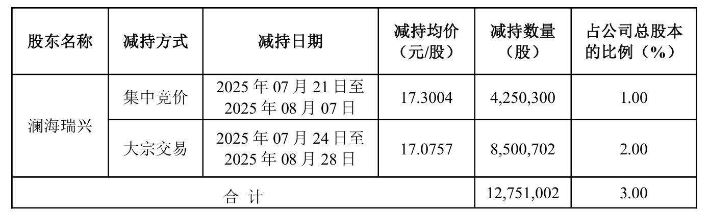 7月21日至8月28日,澜海瑞兴同样因经营发展资金需要,以集中竞价交易方式和大宗交易方式合计减持公司股份1275万股,占公司总股本比例3%。